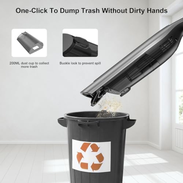 One Empty-touch Design: features a one-touch button, the hand vacuum cordless rechargeable allows you to easy empty dust without touching it directly. The transparent 200ML dust cup effectively stores daily garbage and provides visibility to the vacuuming process. This transparent design not only allows you to see the collected dust but also serves as a reminder to clean the mini vacuum cleaner in a timely manner.