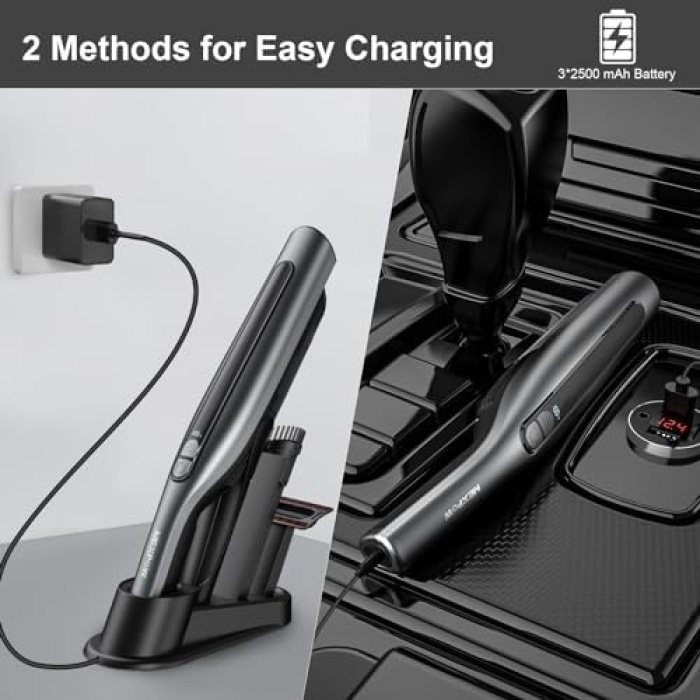7500 mAh Battery & 2 Methods of Charging : with its built-in three batteries, the hand held vacuum cordless can provide continuous operation for up to 30 minutes on the lower suction level and 15 minutes on the higher level after a full charging time of 4-6 hours. Moreover, by offering both home charging with a dedicated base and on-the-go charging through a car’s USB port, this car vacuum portable cordless can be ready for use whenever needed.