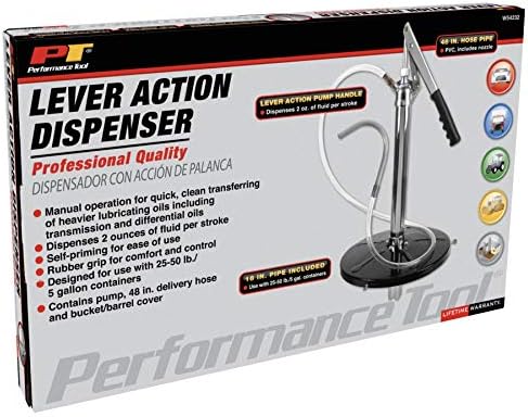 EFFICIENT FLUID DISPENSING: The Performance Tool W54232 Lever-Action Bucket Pump is designed to efficiently dispense transmission and other heavier fluids from 5-gallon pails.