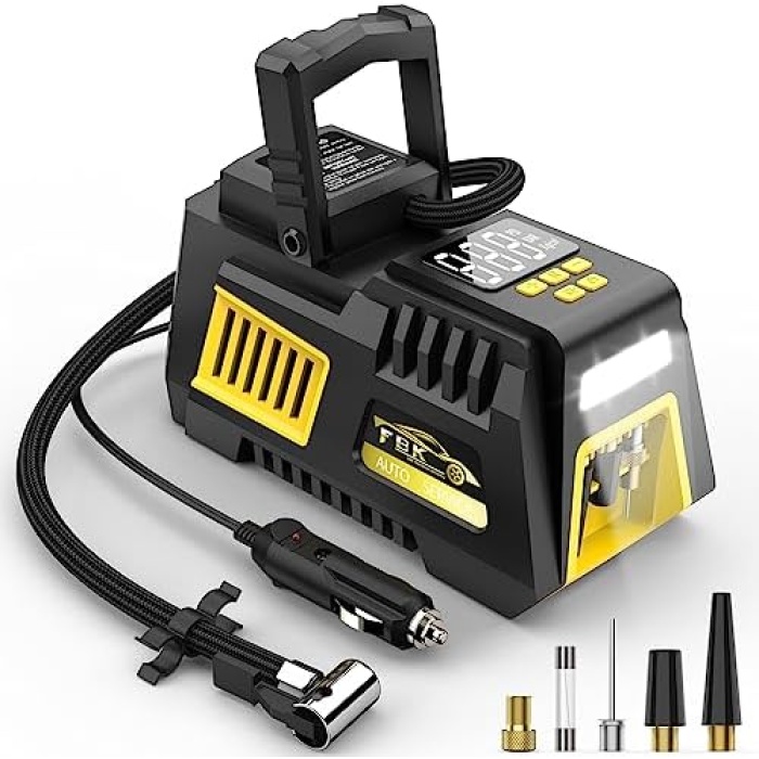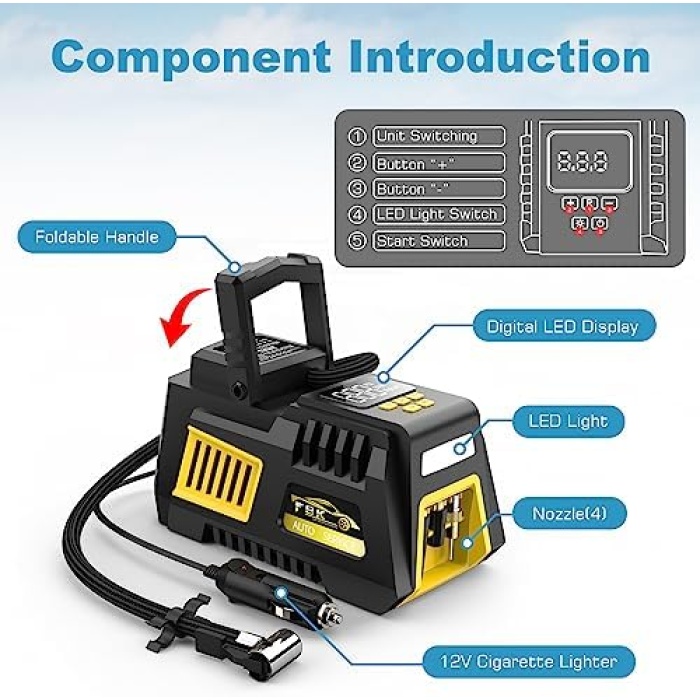 Digital Display & LED Lighting: The tire inflator is equipped with a large high-precision and high-brightness display to help you check the tyre pressure and preset the tyre presure values. The air compressor gauge can display the pressure in PSI, BAR & KG/CM². Air pump is equipped with bright and long-lasting LED lights, easy to use even in the dark.