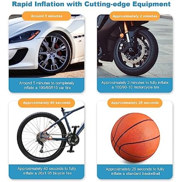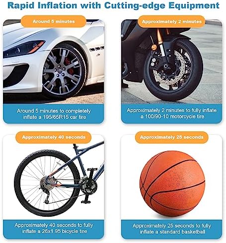 Strong Power & Fast Inflation: With maximum pressure 150 PSI and air flow 35L/min, it can inflate the 195/65R15 car tire from 0 to 35psi under 5min. It makes inflating tires in emergency easier and more convenient. Please NOTE that after 15 minutes of continuous use, let the air compressor rest and cool for an equal amount of time at a minimum before continuing use.
