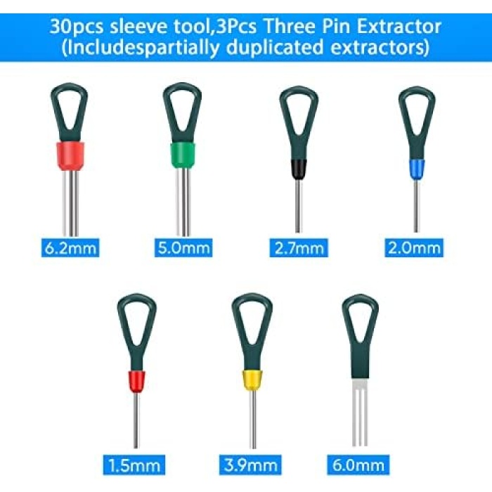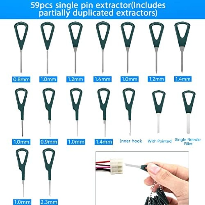 【Package Include】 172 Pieces electrical pin removal tool kit includes 59Pcs Single Pin Extractor, 80Pcs Double Pin Extractor, 3Pcs three pin extractor, 30Pcs Casing Tool and protective bag. ( NOTE: Some of the terminal removal tools are duplicate )